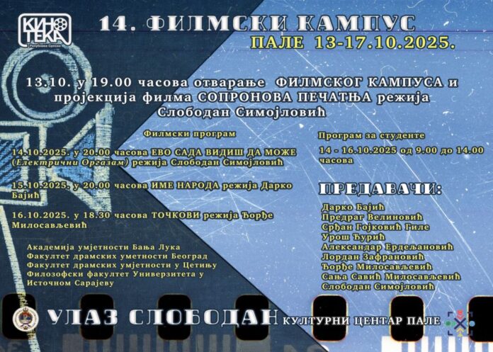 Кинотека Републике Српске организује 14. по реду Филмски кампус- програм за студенте од 13. до 17. октобра у Палама.